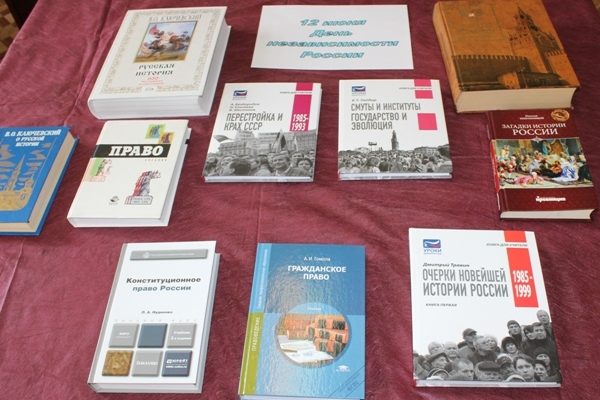 На выставке представлены материалы об истории возникновения праздника, Конституция и Гражданский кодекс Российской Федерации. Целью данной выставки является воспитание гражданско -патриотических чувств у обучающихся, а главное любви к Родине и ее основным документам. Преподавателем обществознания Меркурьевой В.А. проведен открытый Урок : «Символы единства России ». Обучающимся рассказали, что эта дата дважды знаменательна. 12 июня 1990 года, еще во времена СССР, первый Съезд народных депутатов РСФСР принял Декларацию о государственном суверенитете России, а ровно год спустя, 12 июня 1991 года, состоялись первые в истории России всенародные прямые открытые выборы президента, на которых победил демократ Борис Ельцин .В 1994 году первый Президент России Борис Ельцин своим Указом придает 12 июня государственное значение — День принятия декларации о государственном суверенитете России.Россия имеет официальные символы в виде герба, флага и гимна.