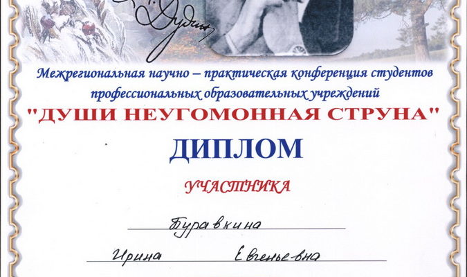 09 ноября 2016 года обучающаяся группы №6 Буравкина Ирина выступила на Межрегиональной научно-практической конференции студентов профессиональных образовательных учреждений «Души неугомонная струна…», посвященной 100 летию со дня рождения  М.А. Дудина, с эссе «Мне всё здесь дорого и свято…». Работа была подготовлена под руководством преподавателя Меркурьевой В.А.. Буравкина Ирина награждена дипломом участника конференции.