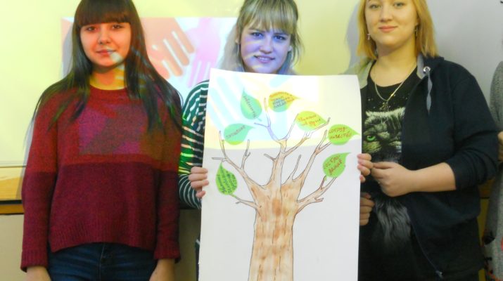 На классном часе студенты занимались самосовершенствованием через решение проблемных ситуаций и  выполнение творческих заданий.  Ребятам было предложено коллективно сделать «дерево Толерантности». Общее дело способствовало преодолению психологических барьеров  вовремя общения, и самое главное, научиться,  уважительно относиться к себе и окружающим.