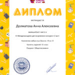 Во второй половине октября обучающиеся первого и второго курсов приняли участие в 12 Всероссийской олимпиаде по гуманитарным предметам (по истории и обществознанию). В результате дипломы 1 степени по истории получили обучающиеся Тюленёва К. (группа №9 по профессии 09.01.03 «Мастер по обработке цифровой информации»), Долматова А. (группа № 12 по профессии 43.01.09 «Повар, кондитер»). Дипломы 1 степени по обществознанию получили обучающиеся Спицина Е. (группа №6 по профессии 09.01.03 «Мастер по обработке цифровой информации»), Арутюнова А. (группа № 12 по профессии 43.01.09 «Повар, кондитер»). (сертификат)