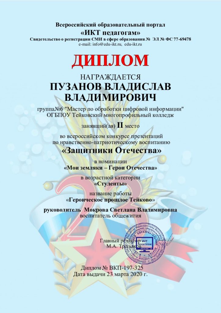 23 марта 2020г. были подведены итоги Всероссийского конкурса презентаций по нравственно-патриотическому воспитанию «ЗАЩИТНИКИ ОТЕЧЕСТВА». Наши обучающиеся под руководством своих педагогов приняли участие в этом конкурсе. Подведя итоги, мы получили 2 диплома. Диплом за 2 место в  номинации «Мои земляки- Герои Отечества» награжден Пузанов Владислав, обучающийся группы № 6 по профессии «Мастер по обработки цифровой информации» и 3 место в номинации «Мои земляки- Герои Отечества» обучающийся группы № 3 по профессии «Штукатур» Рябинин Дмитрий Александрович.
