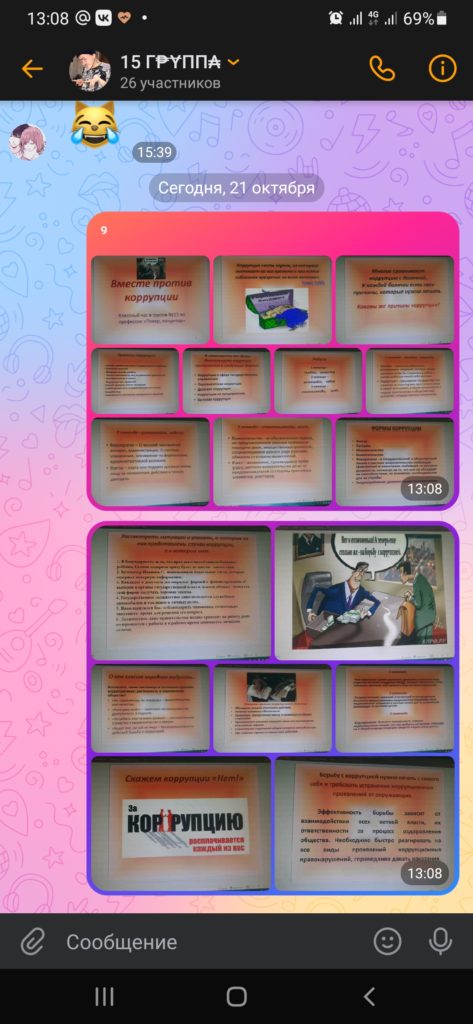 20 октября 2021г. в колледже проведен правовой там-аут. Тема тайм-аута: Правила антикоррупционного поведения и воспитания. Задачами данного тайм-аута являлось: знакомство обучающихся с формами проявления коррупции, ее последствиями, а также нормами уголовной ответственности за коррупционную деятельность; умением формировать навыки адекватного анализа и личностной оценки коррупции.