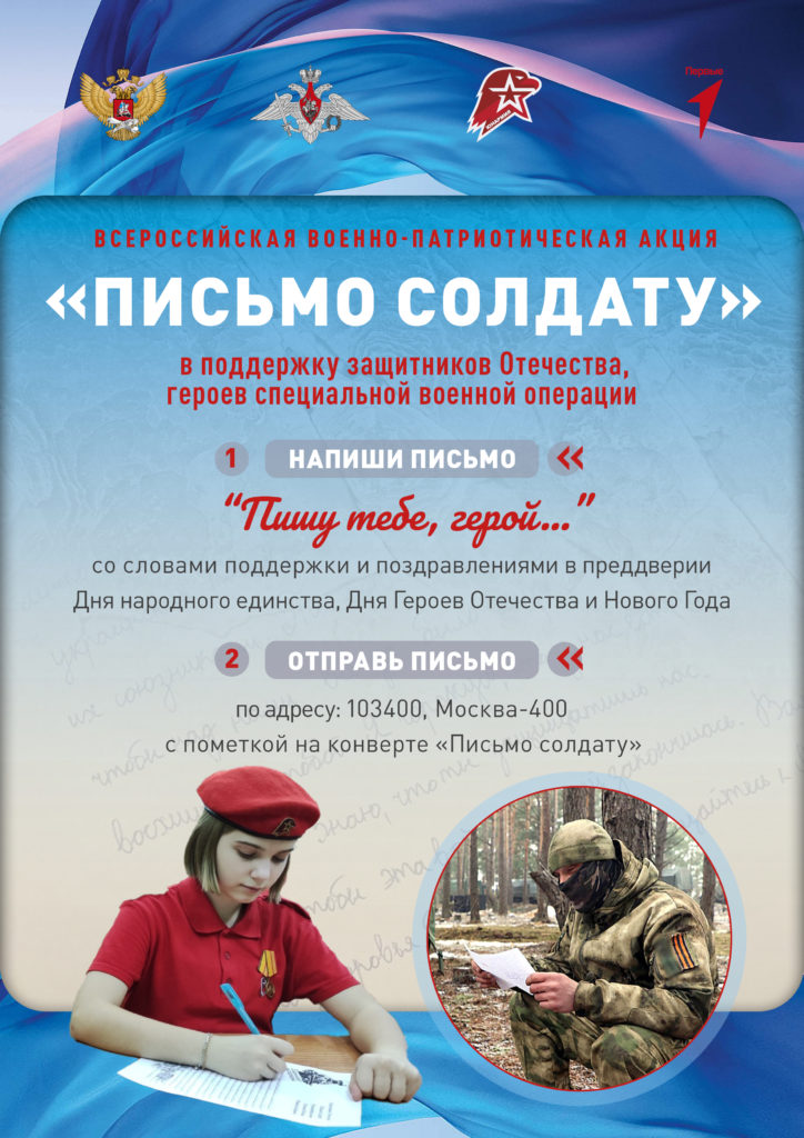 В рамках Акции школьникам, студентам колледжей и представителям детско-юношеских общественных объединений предлагается написать поздравления военнослужащим, принимающим (принимавшим) участие в специальной военной операции. Направлять письмо необходимо по адресу: 103400, Москва-400, с пометкой «Письмо солдату».