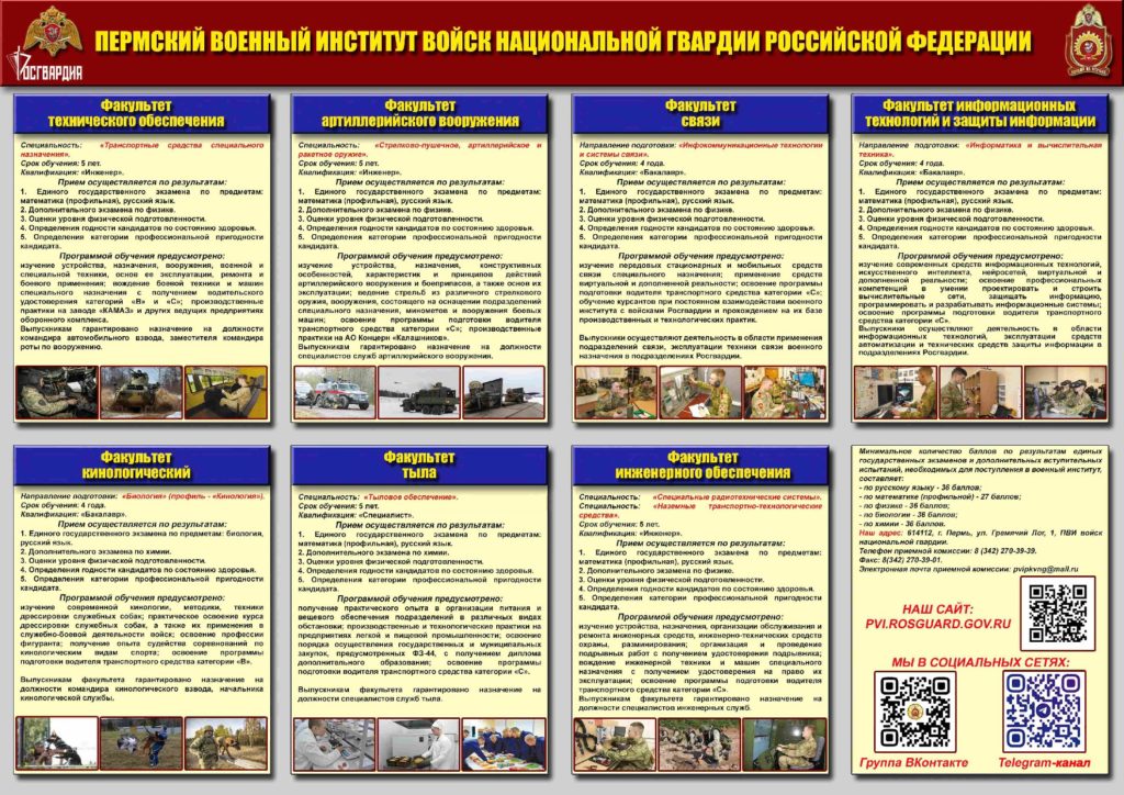Федеральное государственное казенное военное образовательное учреждение высшего образования «Пермский военный институт войск национальной гвардии Российской Федерации» осуществляет прием на обучение в 2024 году на семь факультетов: