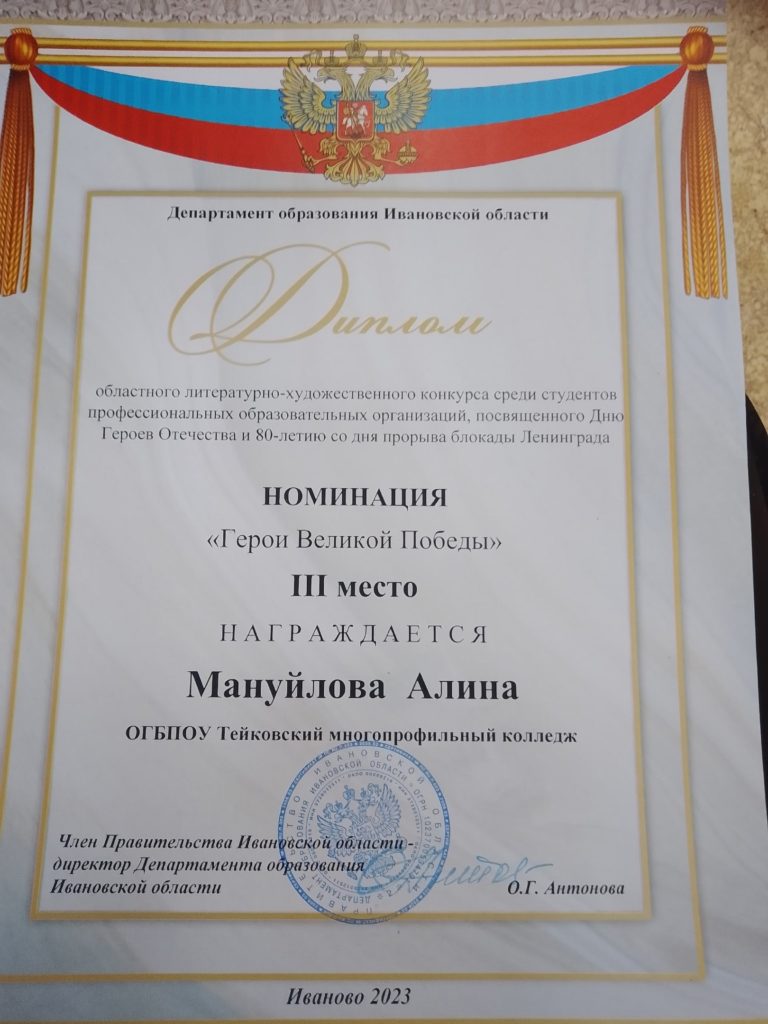 Обучающаяся 1 курса по специальности «Конструирование, моделирование и технологи изготовления изделий легкой промышленности ( по видам) » , Мануйлова Алина, заняла 3 место в номинации «Герои Великой Победы». Поздравляем и желаем дальнейших творческих успехов.