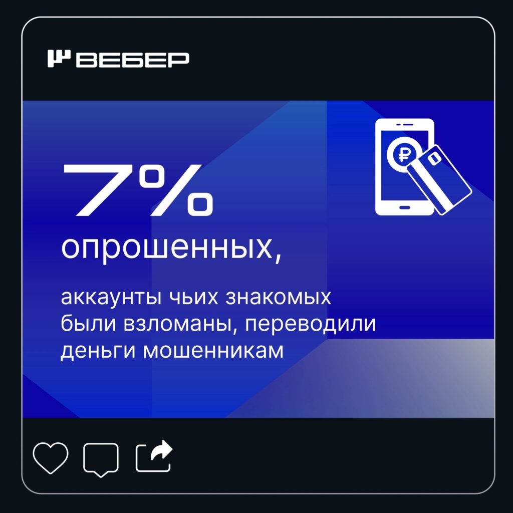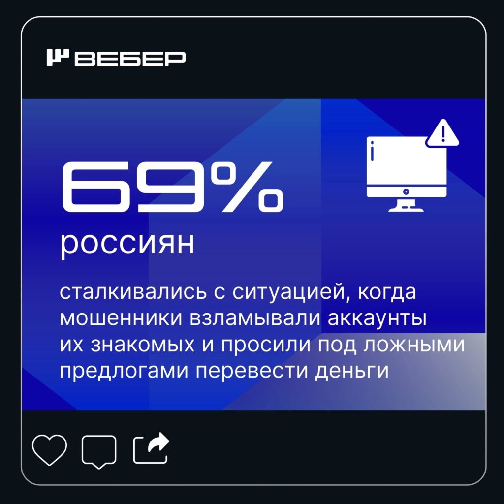 Социологическое агентство «Вебер» сообщило, что 69 % россиян сталкивались с ситуацией, когда мошенники взламывали аккаунты их знакомых и просили перевести деньги.