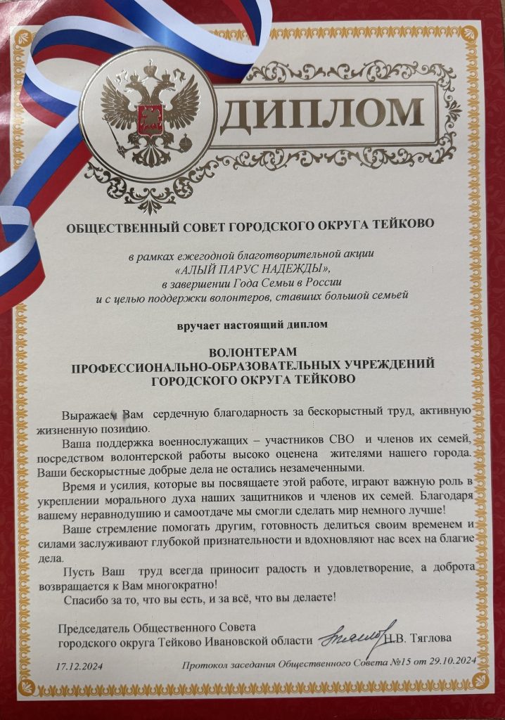 С гордостью сообщаем, что общественный совет городского округа Тейково наградил наш колледж ДИПЛОМОМ в рамках ежегодной благотворительной акции «АЛЫЙ ПАРУС НАДЕЖДЫ». Это событие стало прекрасным завершением Года Семьи в России и было посвящено поддержке волонтеров, которые стали настоящей большой семьей для многих людей.Мы гордимся тем, что наши обучающиеся и преподаватели активно участвуют в жизни города, внося свой вклад в добрые дела и поддержку тех, кто в этом нуждается.