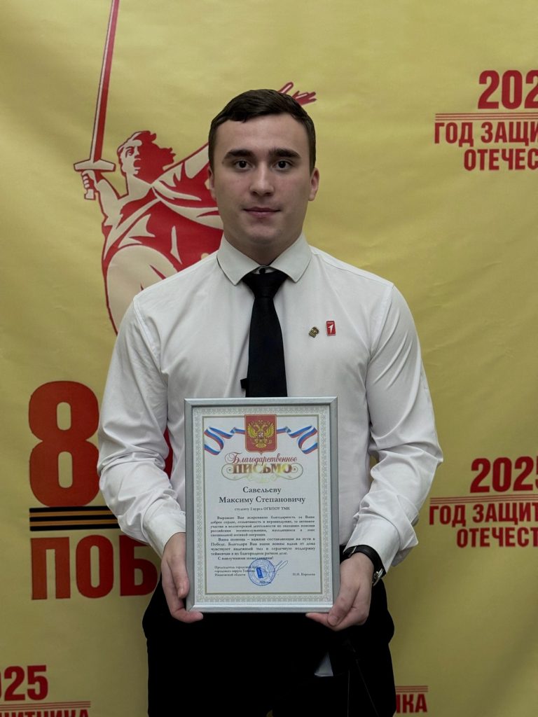 Обучающийся нашего Тейковского многопрофильного колледжа Савельев Максим Степанович был награждён Благодарственным письмом городской Думы городского округа Тейково за активное участие в волонтерской деятельности по оказанию помощи российским военнослужащим, находящимся в зоне СВО.