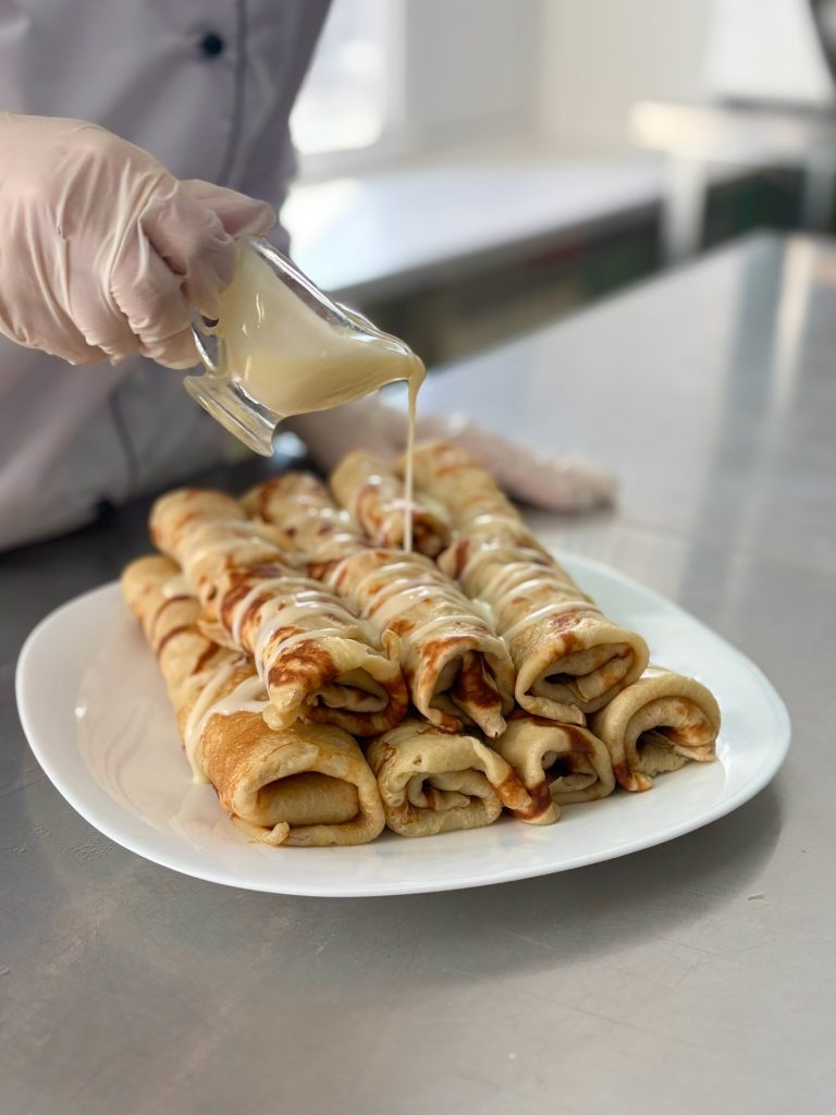✨На занятии ребята приготовили горячее сладкое блюдо «Блины». Фаршировали блинчики кремом на основе сгущенного вареного молока. Подавали с шоколадным соусом ганаш на белом шоколаде.