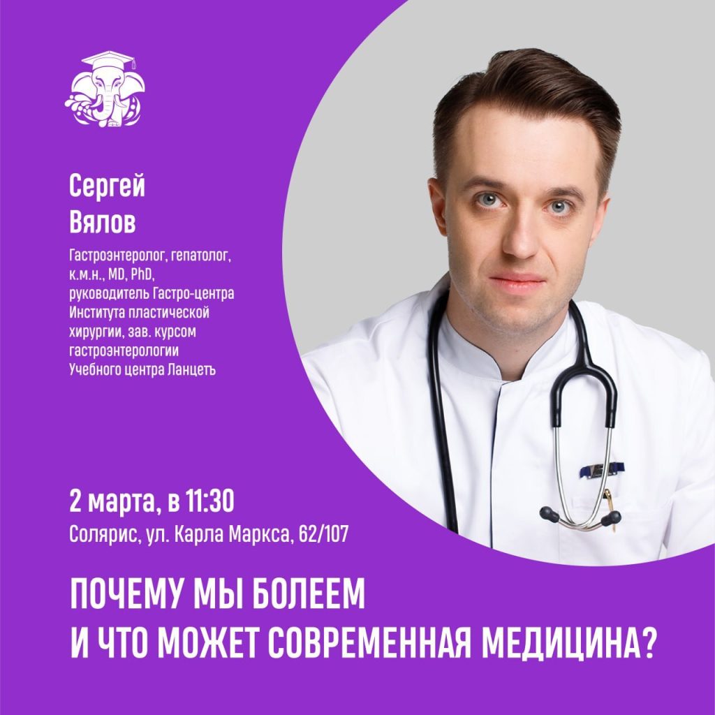 В рамках проекта СЛОН с лекцией выступит известный гастроэнтеролог Сергей Вялов. Он расскажет о современных достижениях медицины, а также о том, кто занимается здоровьем сейчас и кто будет следить за ним в будущем.