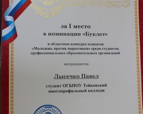 18 мая 2016 г. в Ивановском колледже культуры прошло подведение итогов областного конкурса плакатов «Молодежь против наркотиков». Обучающийся нашего колледжа Лысечко Павел получил Диплом