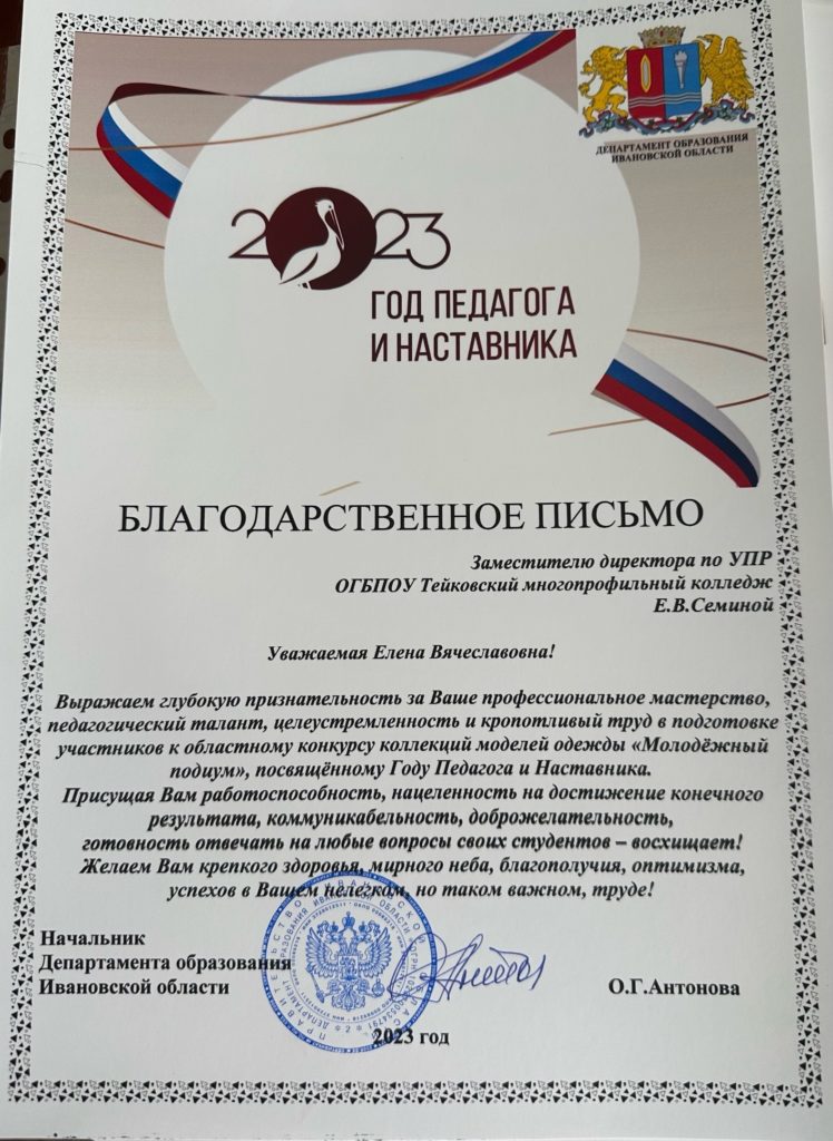 Указом Президента России Владимира Путина в знак высочайшей общественной значимости профессии учителя 2023 год, год 200-летия со дня рождения одного из основателей российской педагогики Константина Дмитриевича Ушинского объявлен Годом педагога и наставника. Миссия Года – признание особого статуса педагогических работников, в том числе выполняющих наставническую деятельность. Преподаватель химии и биологии Хворостухина Оксана Николаевна, являясь наставником Шамриной Кристины, обучающейся 1 курса по профессии «Продавец, контролёр-кассир», прошли в финал Всероссийского конкурса «История местного самоуправления моего края». Коллектив колледжа выражает огромную благодарность взявшему на себя большую часть материальных затрат генеральному директору ООО «МеталлСервис» Сёмину Евгению Николаевичу. Поддержали стремление обучающейся к дальнейшему успеху индивидуальные предприниматели Челышев Н.А., Смирнов С.А.; Полунин С.В., Мухортов Э.Г.; Тихонов П.В.; Мовсесян Г.Р. и ООО «ИвШвейСтандарт» в лице генерального директора Дёмина А.Б. Спасибо за добросердечность, отзывчивость, простое человеческое участие и за поддержку двигаться вперёд!