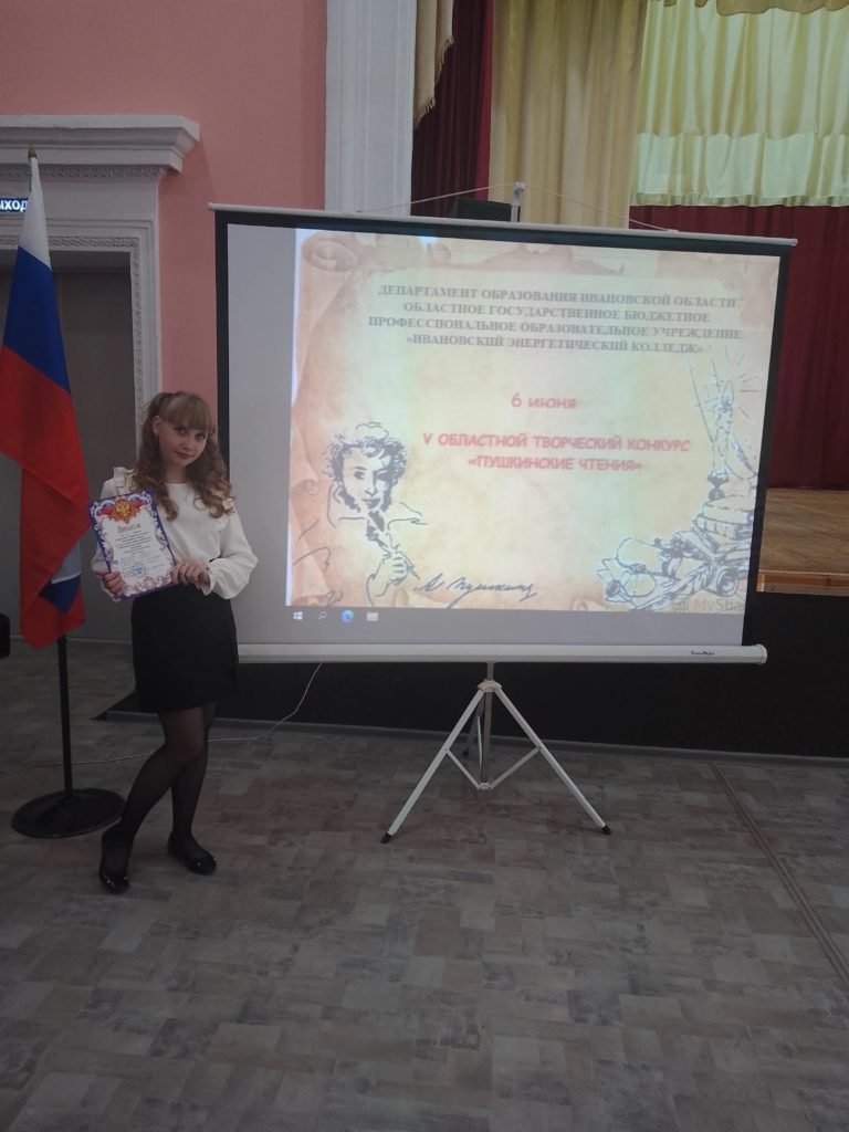 Обучающаяся колледжа Пузанова Дарья приняла участие в V областном творческом конкурсе «Пушкинские чтения». Соревновались 35 обучающихся из колледжей области. Даша заняла 3 место в номинации » Творческие выступления».