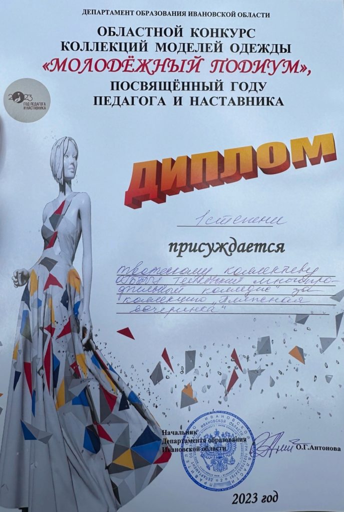 Немаловажную роль в подготовке высококвалифицированных кадров выполняет Всероссийское чемпионатное движение. В 2023 году мероприятия Чемпионата по профессиональному мастерству «Профессионалы» стартовали во всех субъектах Российской Федерации. Участники чемпионатов демонстрировали свои навыки и компетенции по специальности. Обучающаяся нашего колледжа Цыпышева Карина стала призеров, заняв почетное 3 место и получила возможность пройти стажировку на ведущих предприятиях Ивановской области, входящих в состав кластера Легкой промышленности и получить предложение о трудоустройстве. Так же одним из показателей профмастерства является участие в областном конкурсе коллекций моделей одежды «Молодёжный подиум-2023», который прошел на базе областного государственного бюджетного профессионального образовательного учреждения «Родниковский политехнический колледж». Коллекция моделей одежды, изготовленная нашими студентами, под руководством опытных мастеров производственного обучения, заняла  почетное первое место.