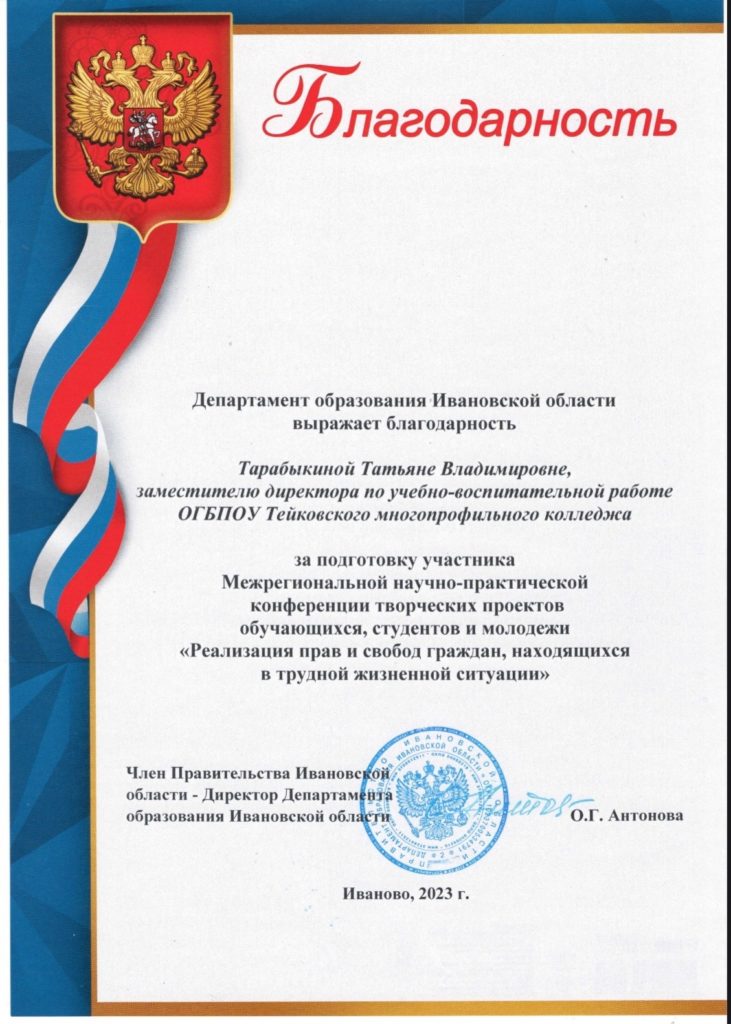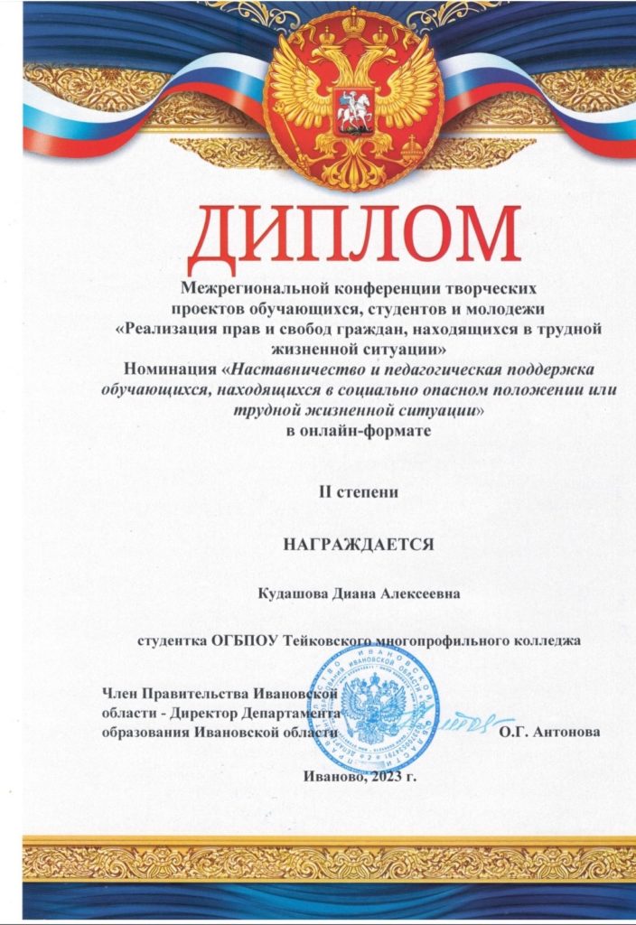 Педагоги и студенты нашего колледжа принимают активное участие в данных мероприятиях, организованных в Ивановской области. Одно из таких – конференция творческих проектов обучающихся, студентов и молодежи. Конференция проходила в Ивановском кооперативном колледже на тему: «Реализация прав и свобод граждан, находящихся в трудной жизненной ситуации». Студентка нашего колледжа — Кудашова Диана, защищала свой проект в номинации «Наставничество и педагогическая поддержка обучающихся, находящихся в социально опасном положении или трудной жизненной ситуации». Ее работа была оценена жюри по достоинству. Диане вручен Диплом 2 степени, а педагогу – наставнику, Тарабыкиной Т.В. — за подготовку участника вручена Благодарность.