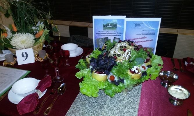 Участники нашего колледжа – обучающиеся третьего курса по профессии Повар, кондитер. В номинации «Поварское искусство» Балуева Надежда представила банкетное блюдо гусь фаршированный яблоками.