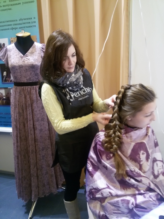 20160316_101053Наряду с профессиональными заведениями Ивановской области колледж развернул свою выставочную экспозицию. В рамках мероприятия были представлены коллекция моделей одежды «Весенний бал», кондитерские изделия, рекламные буклеты. Посетители выставки – старшеклассники и педагоги  смогли поучаствовать  в профессиональных мастер-классах. Мастер производственного обучения Гетьман М. А. демонстрировала приемы обработки шифоновых шарфов, а мастер производственного обучения Барабанова Н. А. делилась секретами создания причесок для повседневной жизни и вечерних выходов. Кроме того, подростки имели возможность задать сотрудникам и студентам колледжа интересующие их вопросы.