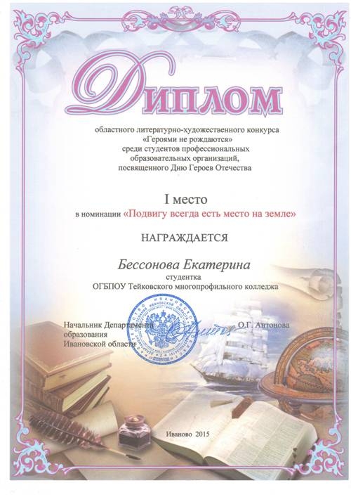 Обучающаяся группы №9 «Мастер по обработки цифровой информации» Бессонова Катерина награждена Дипломом за 1 место в номинации «Подвигу всегда есть место на земле».