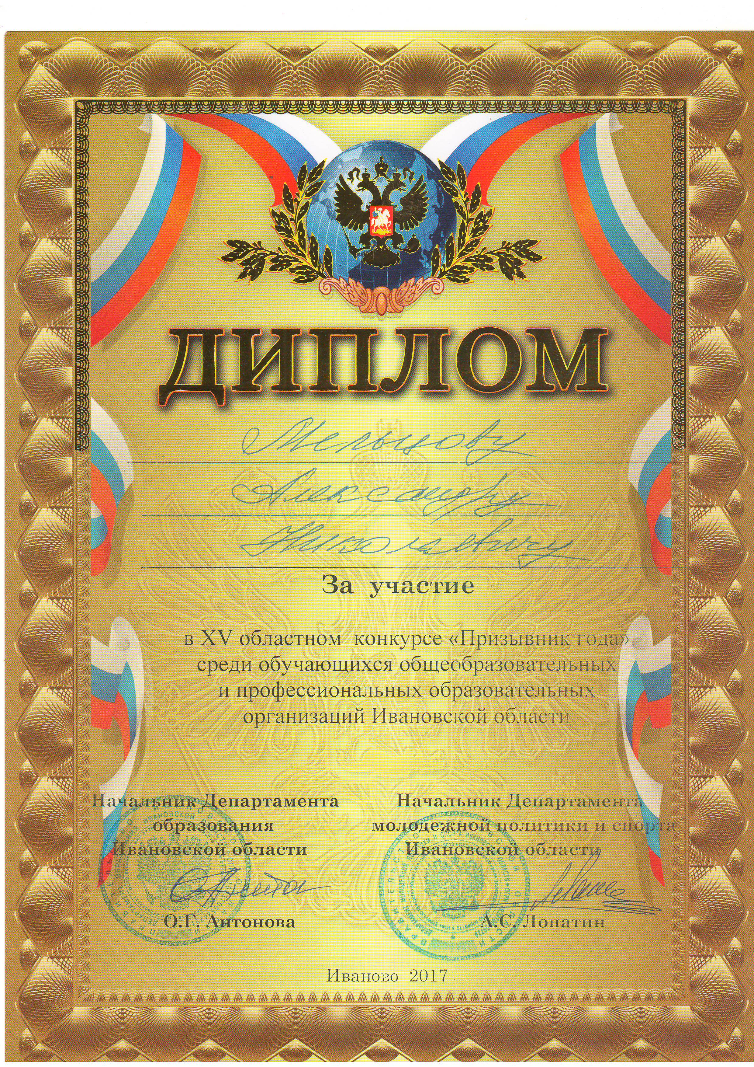 С 10 по 12 мая 2017г. в в/ч 03333 г.Шуя проходил областной конкурс «Призывник года 2017г.» среди обучающихся общеобразовательных и профессиональных образовательных организаций Ивановской области. Наш колледж представлял обучающийся 2 курса группы №12 по профессии «Повар, кондитер» Мельцов Александр. По результатам конкурса Александр был награжден Дипломом за участие.