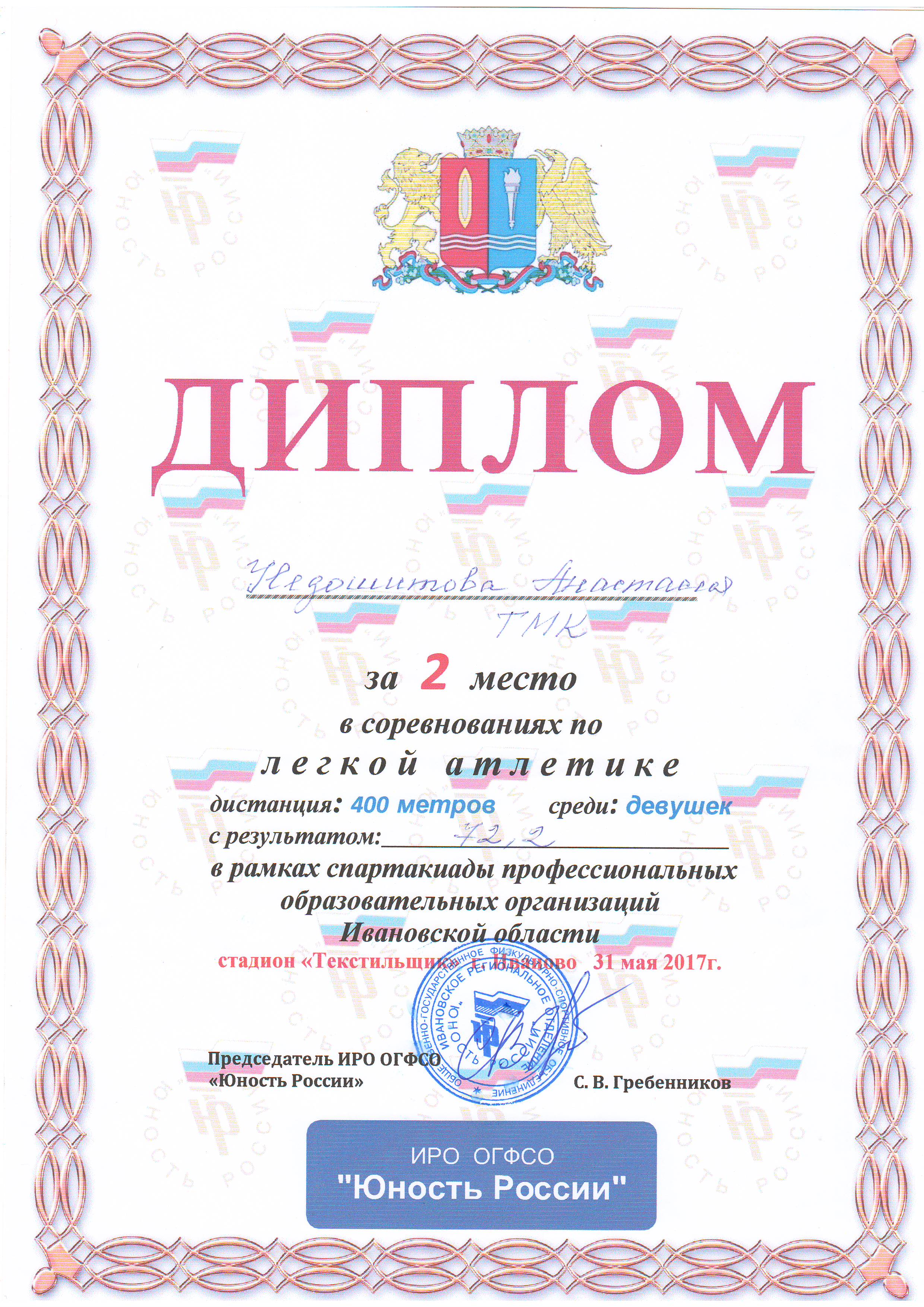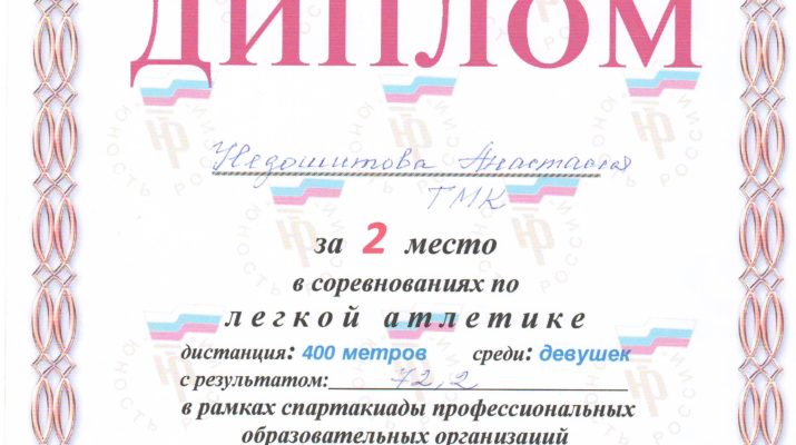 31 мая 2017г. в рамках проведения областных соревнований по легкой атлетике среди юношей и девушек профессиональных образовательных организаций, обучающихся по программам квалифицированных рабочих и служащих «Юность России», которые проходили на стадионе «Текстильщик» г.Иваново, обучающаяся 3 курса Недошитова Анастасия получила Диплом за 2 место в беге на 400 метров.
