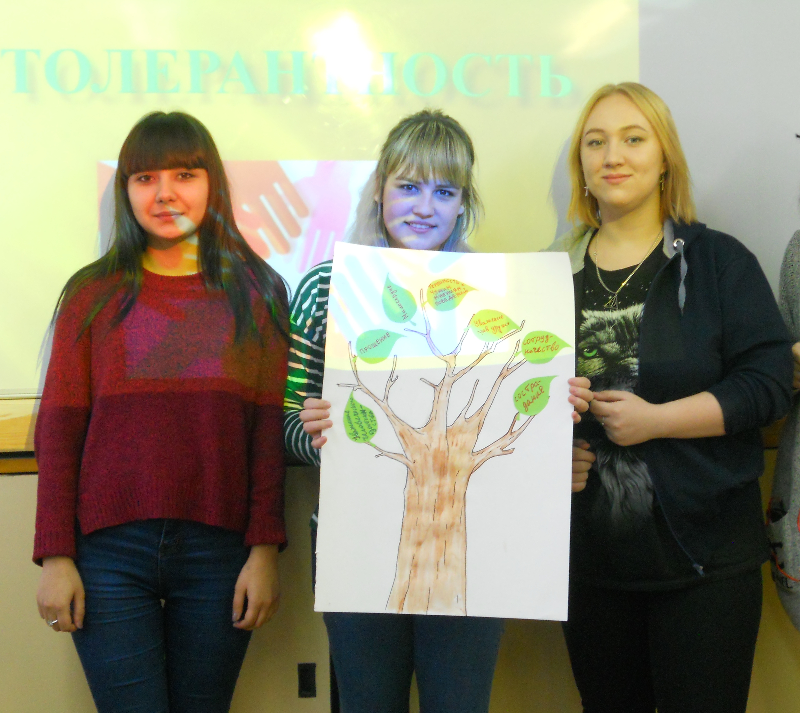На классном часе студенты занимались самосовершенствованием через решение проблемных ситуаций и выполнение творческих заданий. Ребятам было предложено коллективно сделать «дерево Толерантности». Общее дело способствовало преодолению психологических барьеров вовремя общения, и самое главное, научиться, уважительно относиться к себе и окружающим.