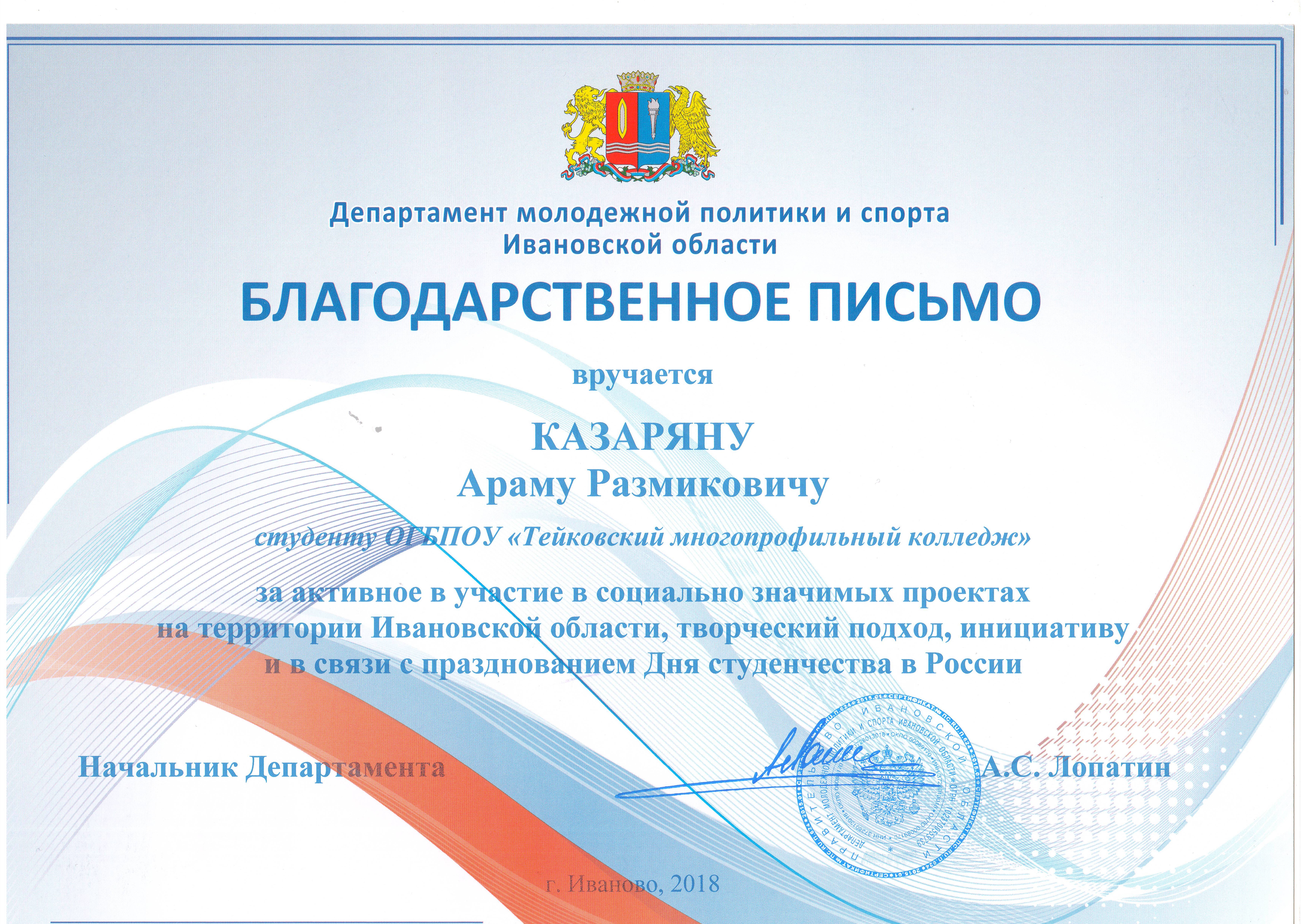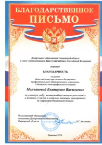 В Ивановском музыкальном училище прошло вручение благодарственных писем студентам, занимающим активную жизненную позицию. Благодарственные письмо Департамента образования Ивановской области  получила студентка  3 курса по профессии «Парикмахер» Молчанова Екатерина  . Благодарственное письмо Департамента молодежной политики и спорта Ивановской области было вручено Казаряну Араму.