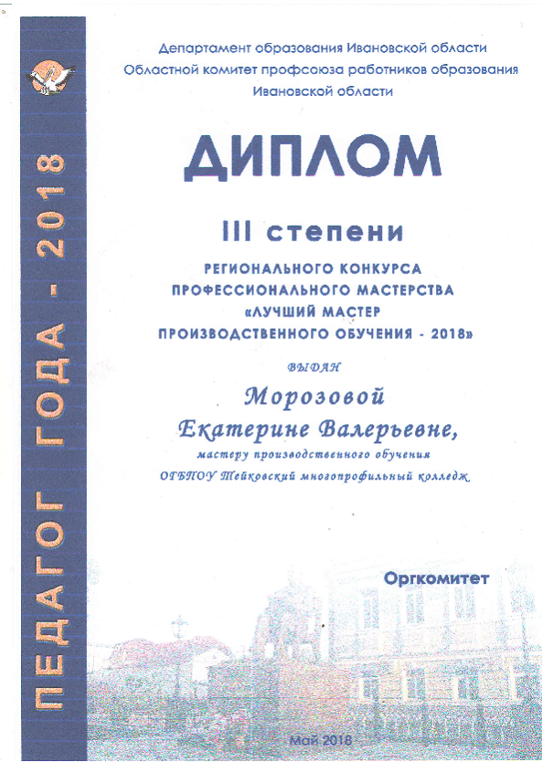 Мастер производственного обучения по профессии «Повар, кондитер» Морозова Екатерина Валерьевна стала финалисткой конкурса и завоевала диплом IIIстепени регионального конкурса профессионального мастерства «Лучший мастер производственного обучения – 2018». Коллеги Екатерины Валерьевны поздравляют с достигнутым результатом и желают дальнейших успехов и побед в профессиональной деятельности.