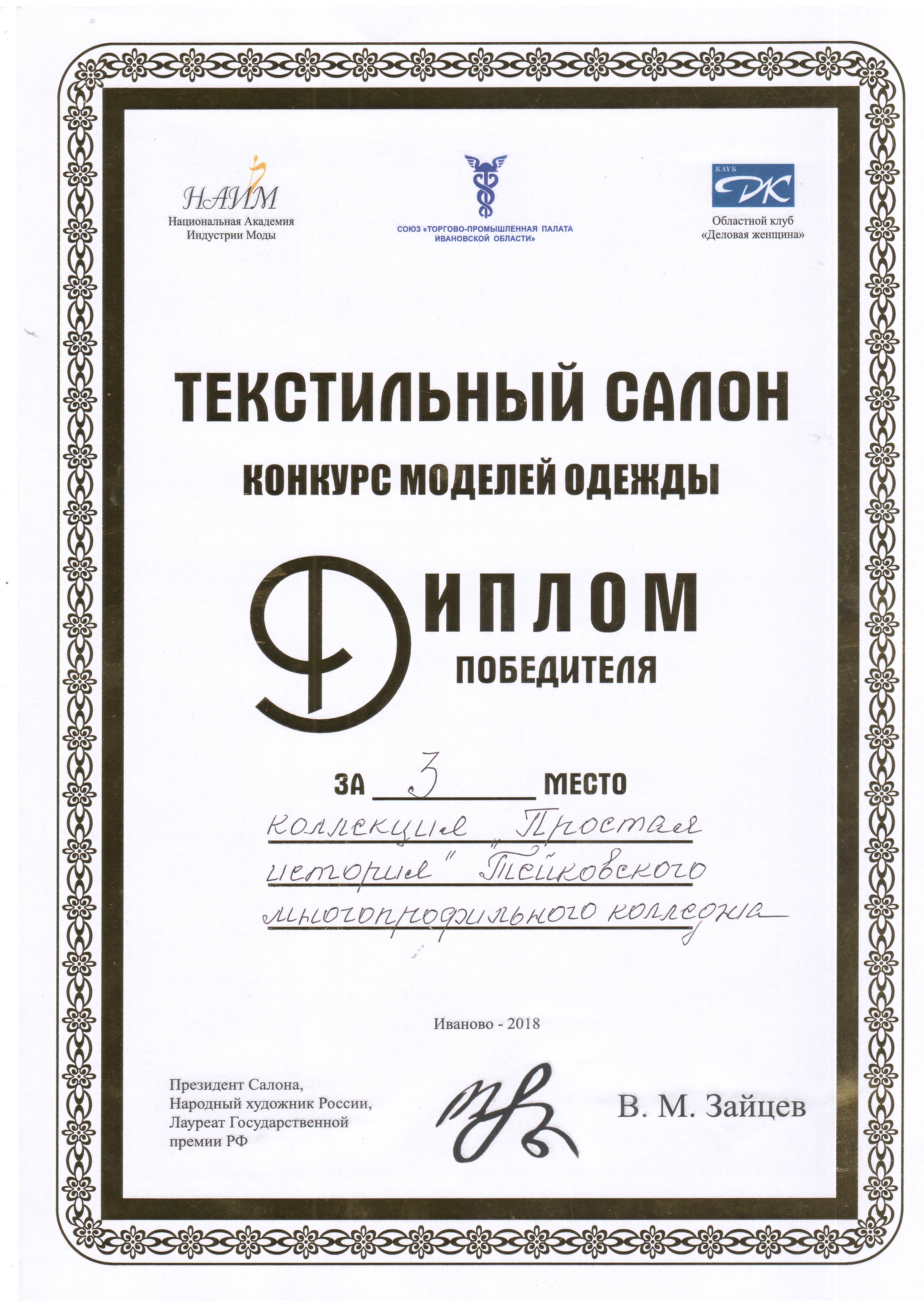 По итогам проведения «Текстильного салона», который состоялся в рамках фестиваля, Тейковский многопрофильный колледж был удостоен третьего призового места.