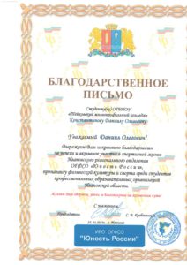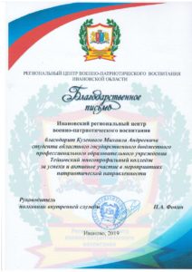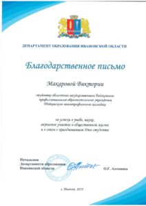 25 января 2019г. в Ивановском колледже культуры прошло торжественное мероприятие, посвященное Всероссийскому Дню студента. На этом мероприятии прошло награждение Благодарственными письмами студентов, отличившимися в различных направлениях. Трое студентов нашего колледжа были награждены Благодарностями. Благодарственным письмом ДЕПАРТАМЕНТА ОБРАЗОВАНИЯ ИВАНОВСКОЙ ОБЛАСТИ награждена Макарова Виктория за успехи в учебе, науке, активное участие в общественной жизни и в связи с празднованием Дня студента. Благодарственным письмо ИВАНОВСКОГО РЕГИОНАЛЬНОГО ОТДЕЛЕНИЯ ОГФСО «ЮНОСТЬ РОССИИ» за пропаганду физической культуры и спорта среди студентов профессиональных образовательных организаций Ивановской области награжден Константинов Даниил. Благодарственное письмо РЕГИОНАЛЬНОГО ЦЕНТРА ВОЕННО-ПАТРИОТИЧЕСКОГО ВОСПИТАНИЯ ИВАНОВСКОЙ ОБЛАСТИ за успехи и активное участи в мероприятиях патриотической направленности вручено Кузённому Михаилу.