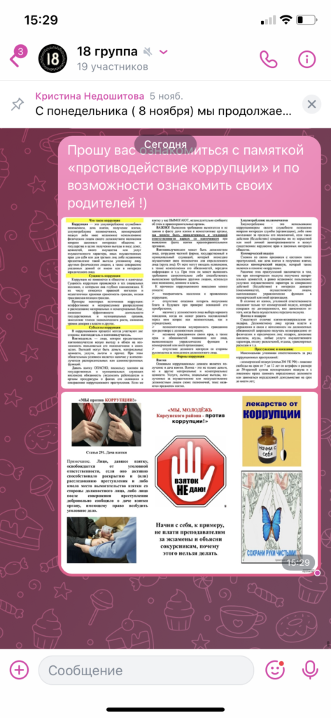 19 ноября 2021г. классными руководителями проведены беседы «Нет коррупции» и «Скажем коррупции — НЕТ». Для обучающихся, находящихся на дистанционном обучении, данная информация размещена на страницах групп в социальных сетях. Целью данного мероприятия является: просвещение, пропаганда и формирование у обучающихся антикоррупционного мировоззрения и воспитание негативного отношения к коррупции.