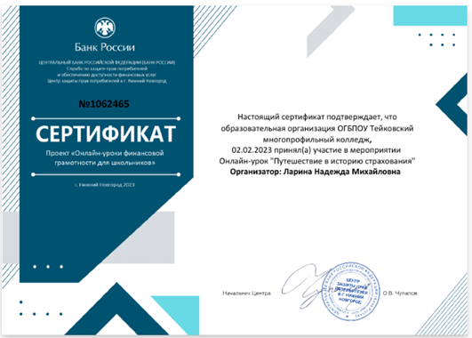 Началась новая сессия онлайн — уроков по «Финансовой грамотности» организованных Банком России преподаватели вместе с обучающимися принимают участие в этих уроках. 02 февраля 2023 года преподаватель Ларина Н.М.  с обучающимися группы №13 по профессии 38.01.02 «Продавец, контролер-кассир»приняла участие в онлайн-уроке «Путешествие в историю страхования».