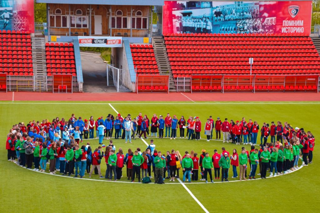 Молодогвардейцы спели песни и вместе с остальными участниками флешмоба выстроились с Российскими флажками в число «101» в честь Дня Пионерии.