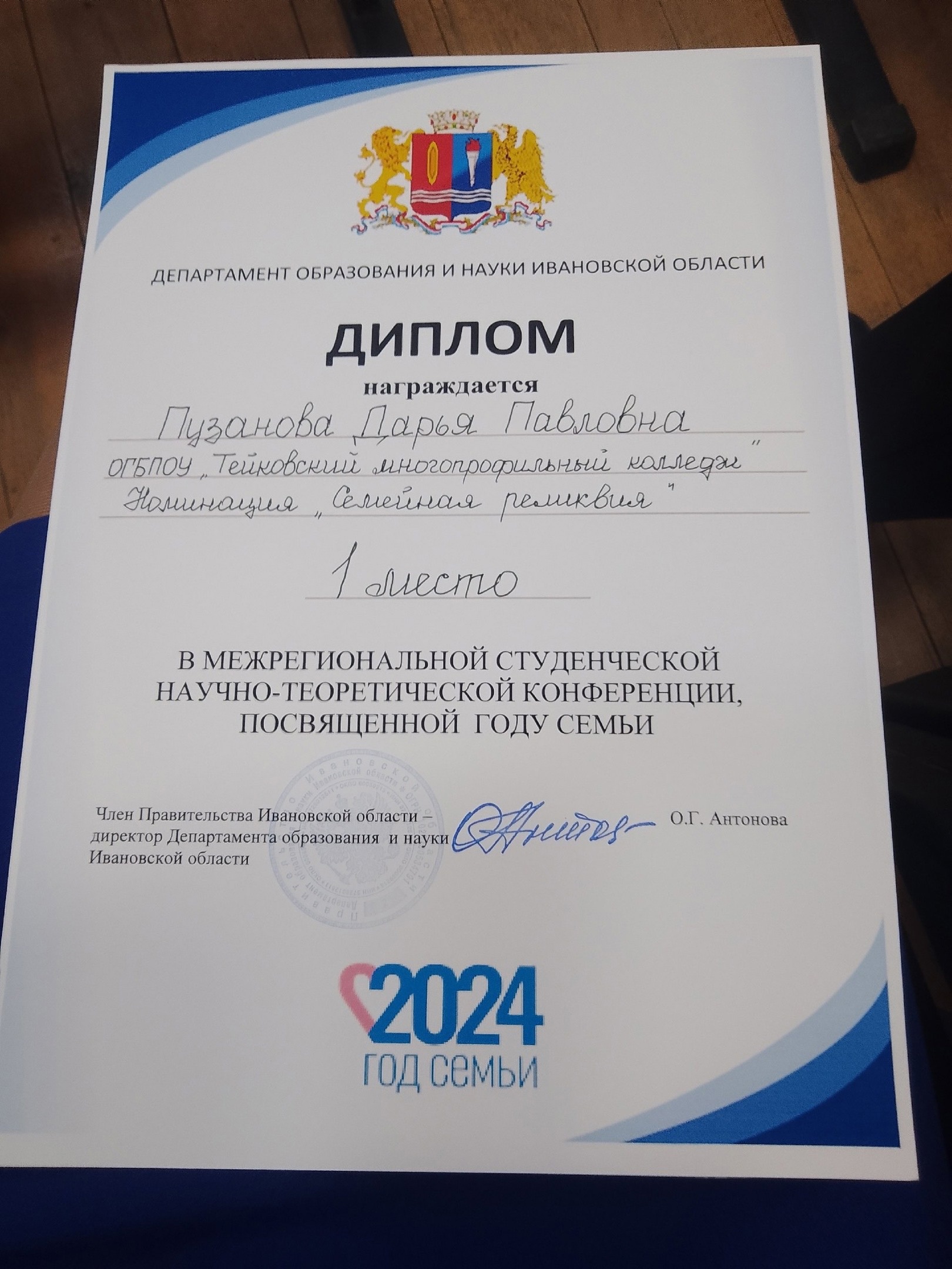 В целях сохранения и увековечивания традиционных семейных ценностей обучающаяся Тейковского многопрофильного колледжа , Пузанова Дарья, под руководством преподавателя русского языка и литературы, Лариной Н.М., подготовила работу «Связь времен и поколений» в номинации «Семейные реликвии».