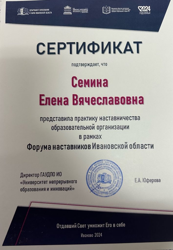 Тейковский многопрофильный колледж на тематической площадке представляла финалист конкурса «Лучшие практики наставничества», заместитель директора по УПР — Семина Е.В., где поделилась своей практикой с присутствующими коллегами на форуме.