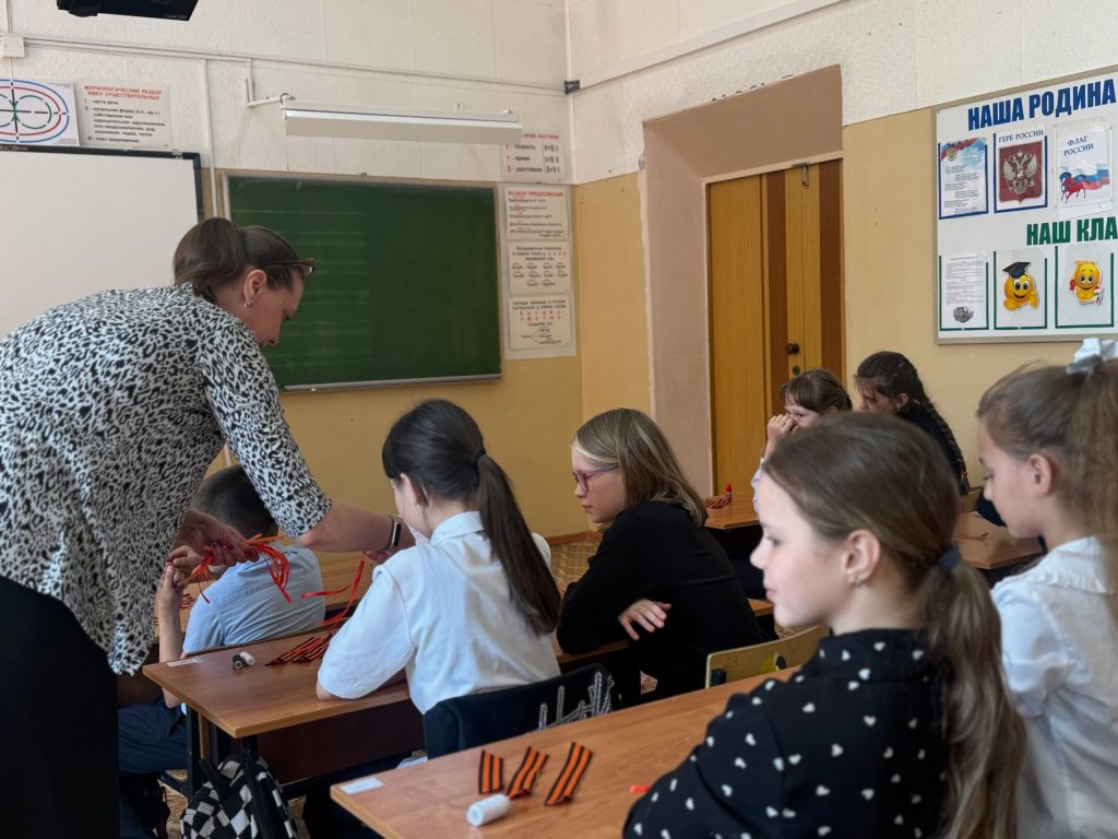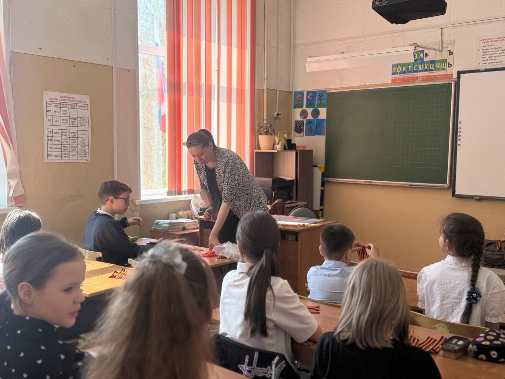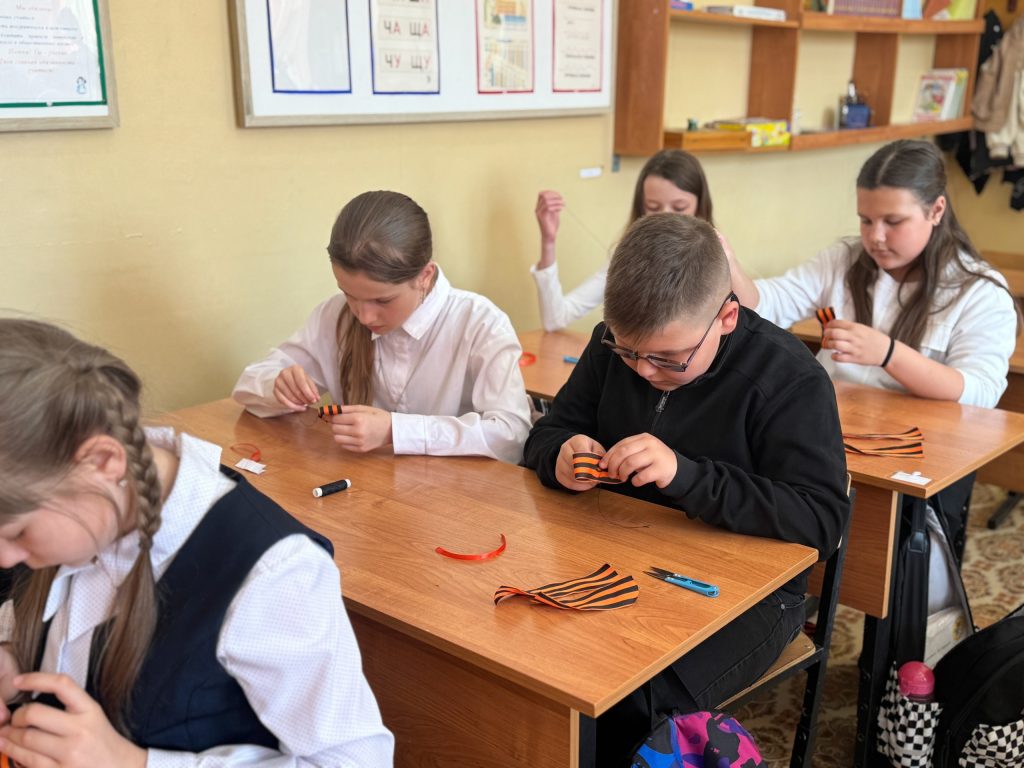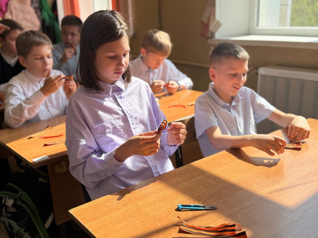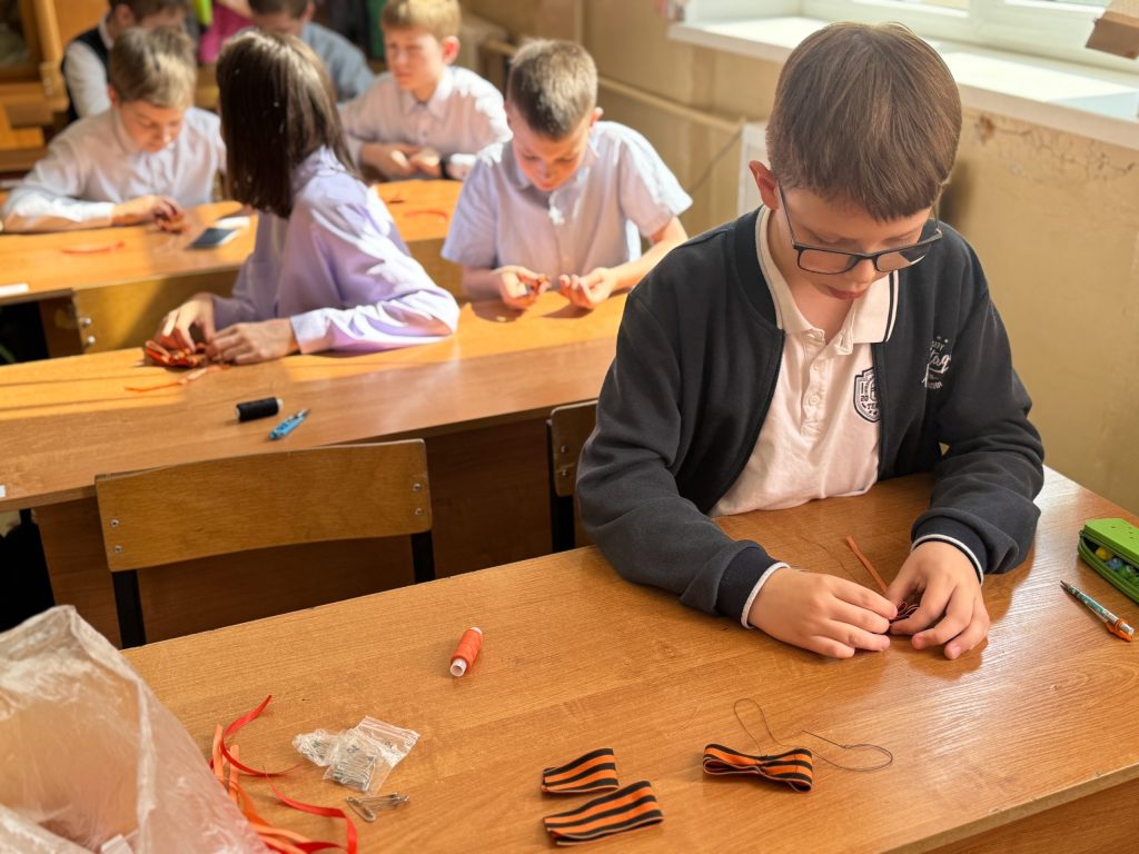 Ученики сделали своими руками георгиевские ленточки, которые они наденут для празднования Дня Победы. Это событие символизирует связь с историей, традициями и семьями.