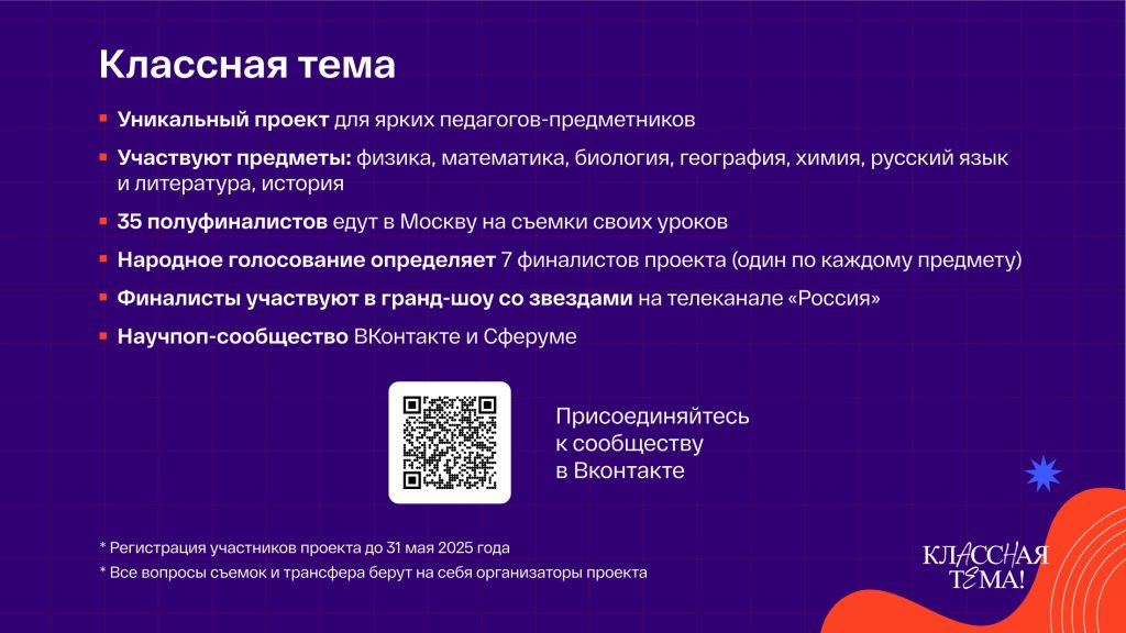 Подать заявку на участие во Всероссийском отборе «Классная Тема!» можно до 31 мая 2025 г. в мини-приложении социальной сети «ВКонтакте» по ссылке: https://vk.com/app51730148.